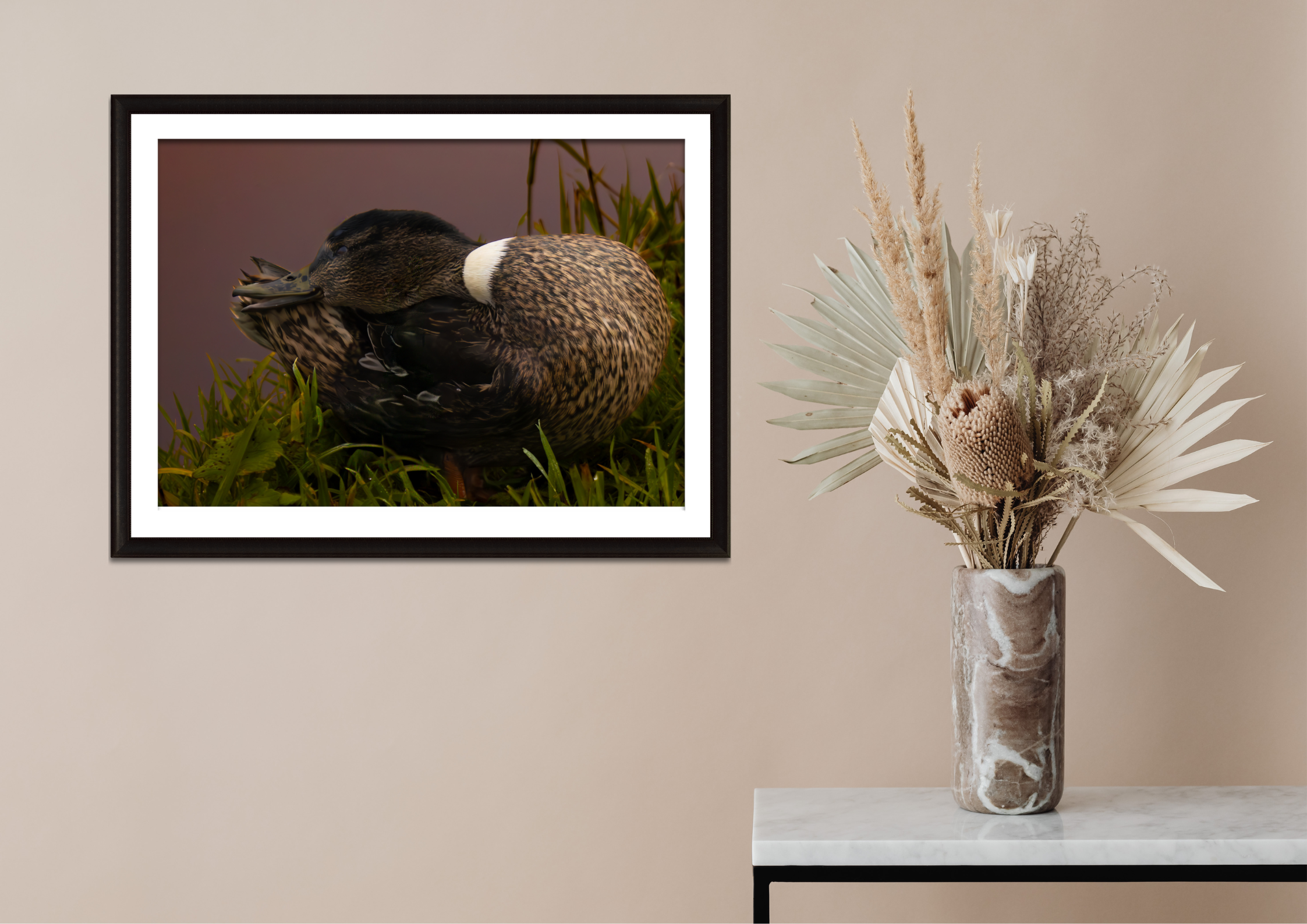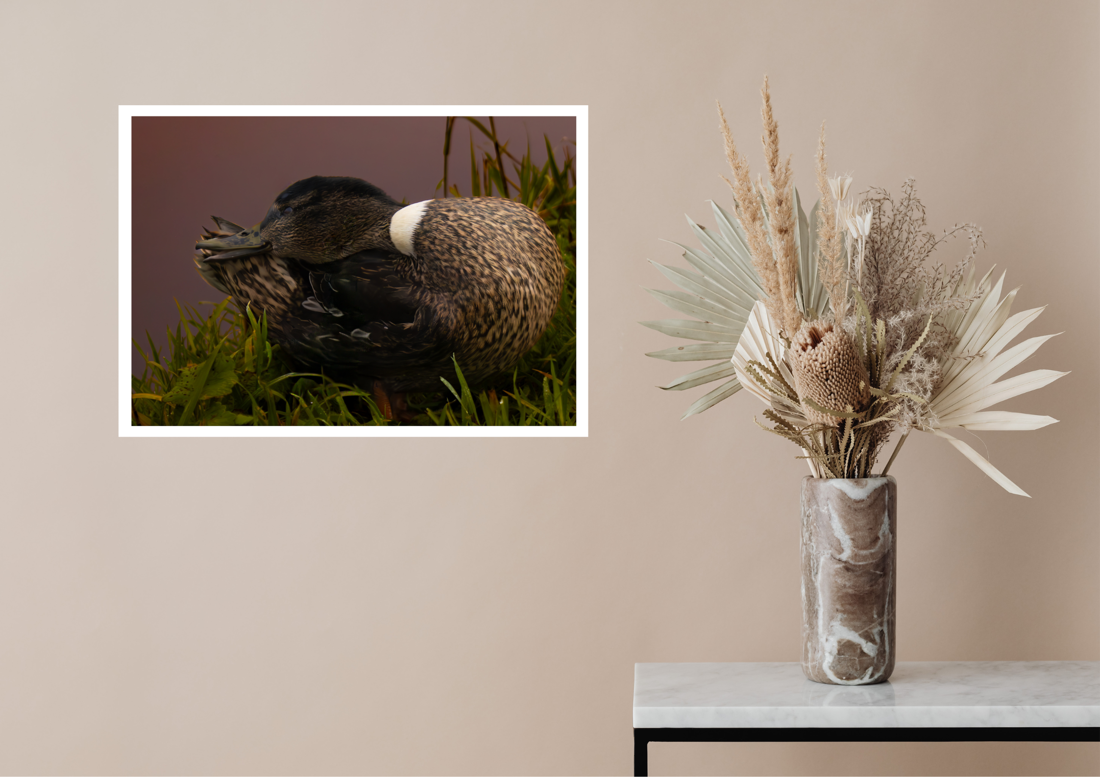 Ik fotografeerde deze prachtige eend en haar partner bij de Zaanse Schans in Zaandijk, in het noorden van Nederland. Ik kon opvallend dichtbij komen zonder hen te verstoren, wat zorgde voor een intieme en memorabele ontmoeting. Het beeld straalt kleur, warmte en de stille schoonheid van alledaagse natuur uit — perfect om een vleugje natuur en charme in elke ruimte te brengen.