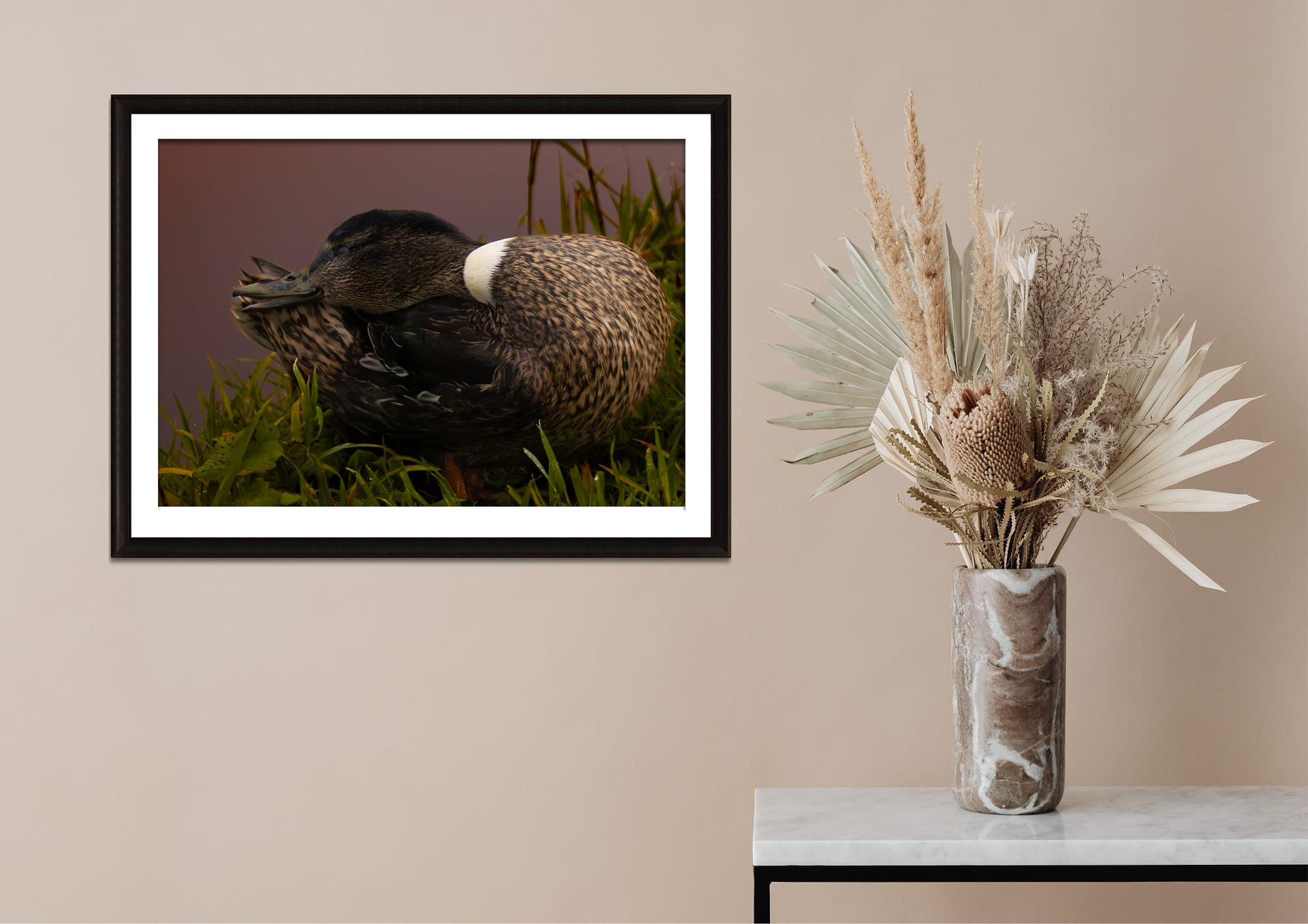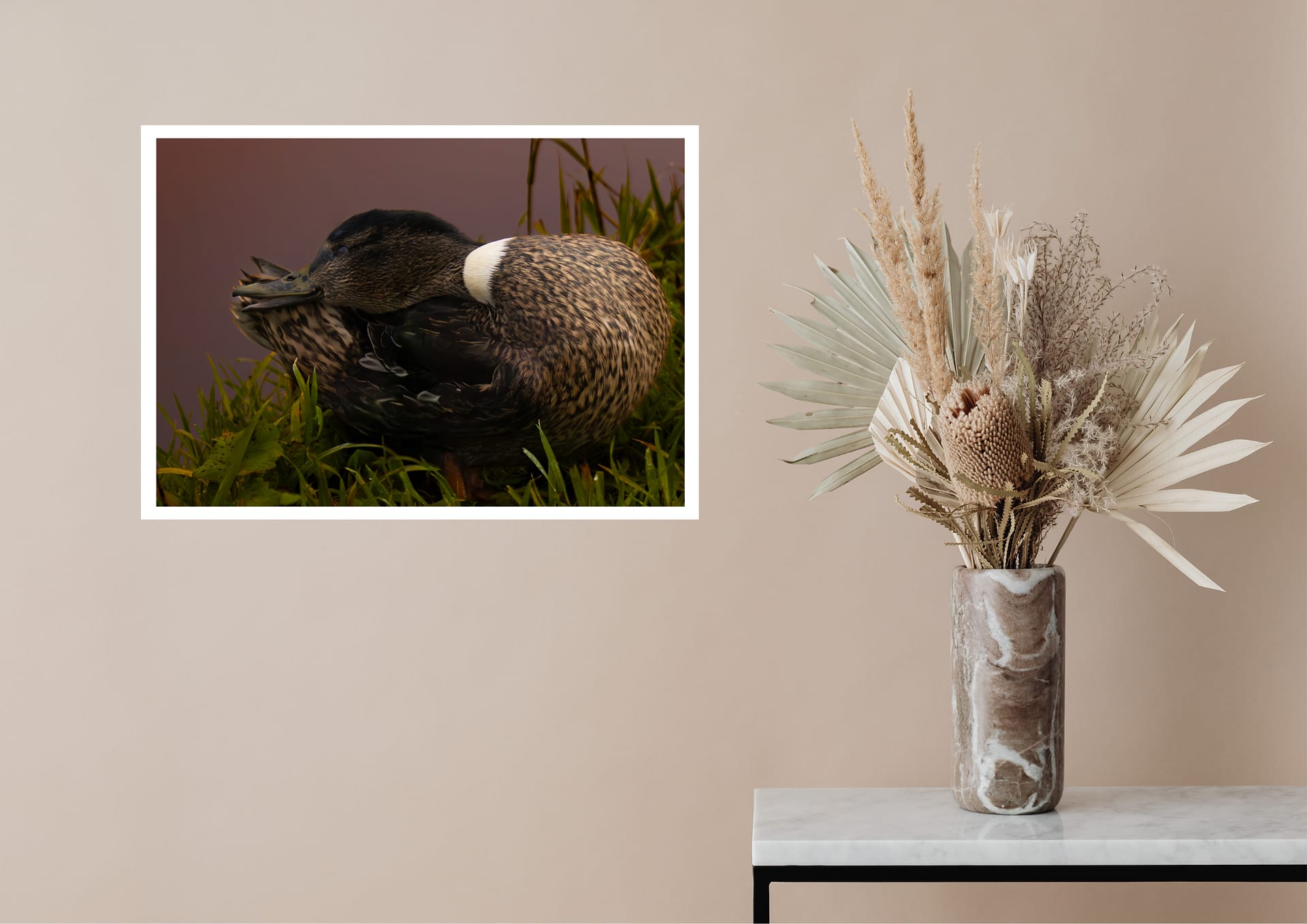Deze levendige foto toont een vrouwtjes eend midden in haar poetsritueel — een charmante weergave van de zorg en precisie van de natuur. Na een verfrissende zwempartij verzorgt ze haar veren verder op het land, waarbij ze de natuurlijke oliën verspreidt die haar verenkleed waterafstotend houden — een verfijnd ritueel vol leven en detail.