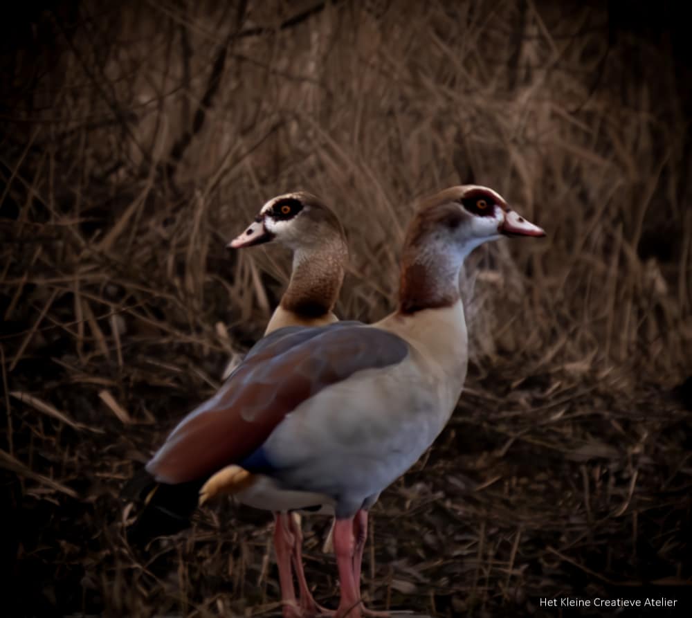 Deze nijlganzen trof ik aan bij de Jagerplas in Zaandam. De voorste gans was opvallend praatgraag en alert, wat mij de indruk gaf dat het om het mannetje ging. Het onderscheid tussen mannetje en vrouwtje is bij nijlganzen lastig, omdat ze vrijwel identiek zijn. Mannetjes zijn doorgaans iets forser gebouwd, wat mijn vermoeden versterkte dat hij waakzaam over zijn partner hield.