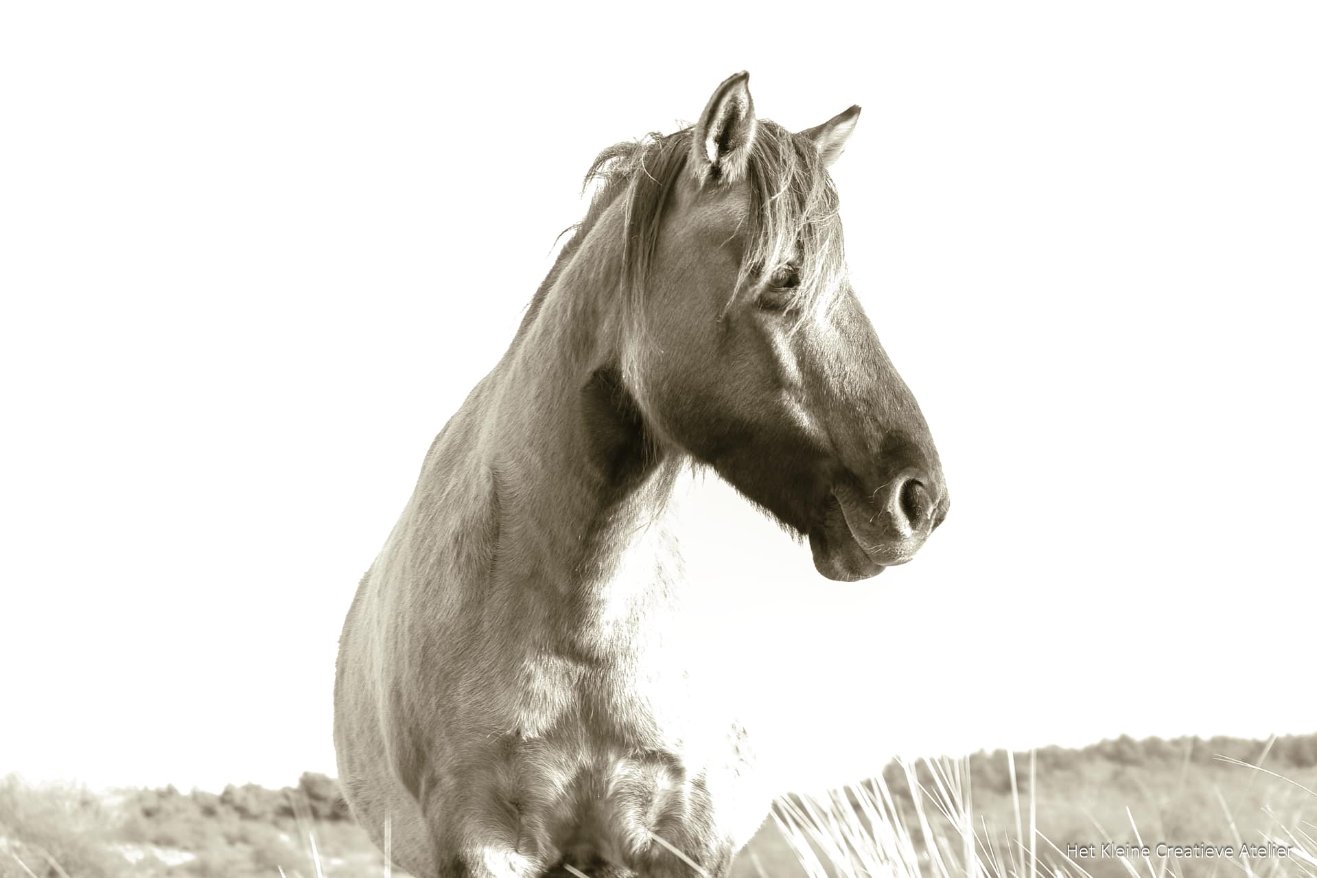 Een zachtaardige Konikpony koestert zich vredig in het zonlicht, vastgelegd in een subtiel overbelicht moment dat de warmte en sereniteit van het tafereel versterkt. De kop is scherp in beeld, met een tedere, expressieve blik die je direct aantrekt. Deze foto viert de stille schoonheid, de rustige aanwezigheid en de eenvoudige charme van de natuur — een tijdloos werk dat warmte en zachte energie in elke ruimte brengt.